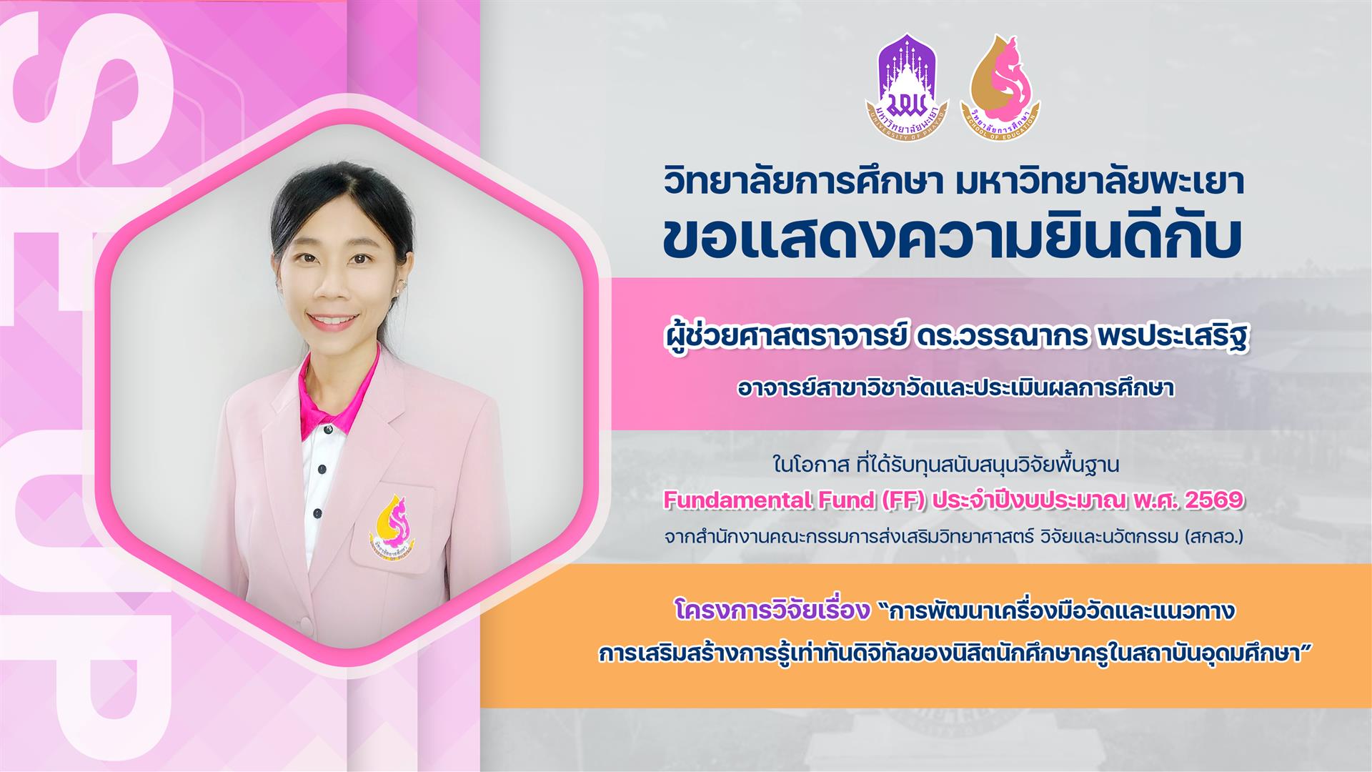 วิทยาลัยการศึกษา มหาวิทยาลัยพะเยา ขอแสดงความยินดีกับ ผู้ช่วยศาสตราจารย์ ดร.วรรณากร พรประเสริฐ อาจารย์สาขาวิชาวัดและประเมินผลการศึกษา ในโอกาสที่ได้รับทุนสนับสนุนวิจัยพื้นฐาน Fundamental Fund (FF) ประจำปีงบประมาณ พ.ศ. 2569 จากสำนักงานคณะกรรมการส่งเสริมวิทยาศาสตร์ วิจัยและนวัตกรรม (สกสว.) โครงการวิจัยเรื่อง “การพัฒนาเครื่องมือวัดและแนวทางการเสริมสร้างการรู้เท่าทันดิจิทัลของนิสิตนักศึกษาครูในสถาบันอุดมศึกษา”