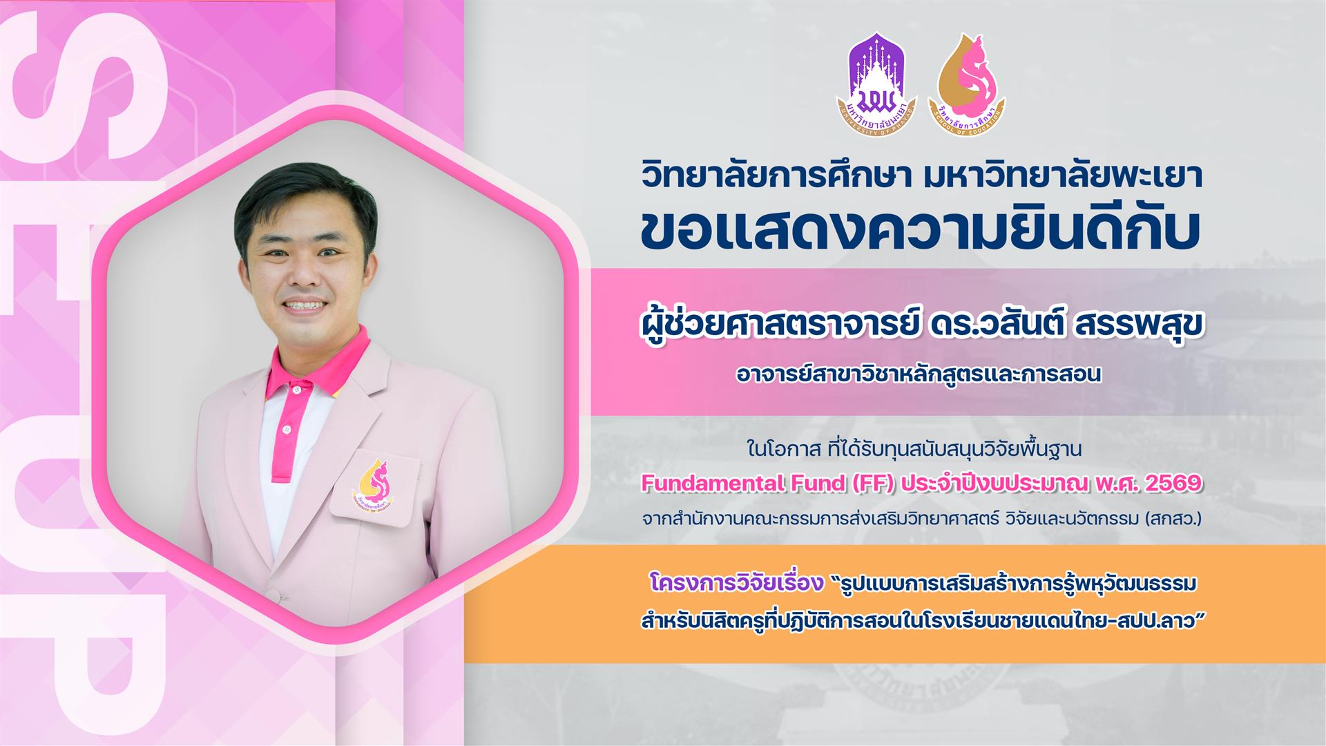 วิทยาลัยการศึกษา มหาวิทยาลัยพะเยา ขอแสดงความยินดีกับ ผู้ช่วยศาสตราจารย์ ดร.วสันต์ สรรพสุข อาจารย์สาขาวิชาหลักสูตรและการสอน ในโอกาสที่ได้รับทุนสนับสนุนวิจัยพื้นฐาน Fundamental Fund (FF) ประจำปีงบประมาณ พ.ศ. 2569 จากสำนักงานคณะกรรมการส่งเสริมวิทยาศาสตร์ วิจัยและนวัตกรรม (สกสว.) โครงการวิจัยเรื่อง “รูปแบบการเสริมสร้างการรู้พหุวัฒนธรรมสำหรับนิสิตครูที่ปฏิบัติการสอนในโรงเรียนชายแดนไทย-สปป.ลาว”