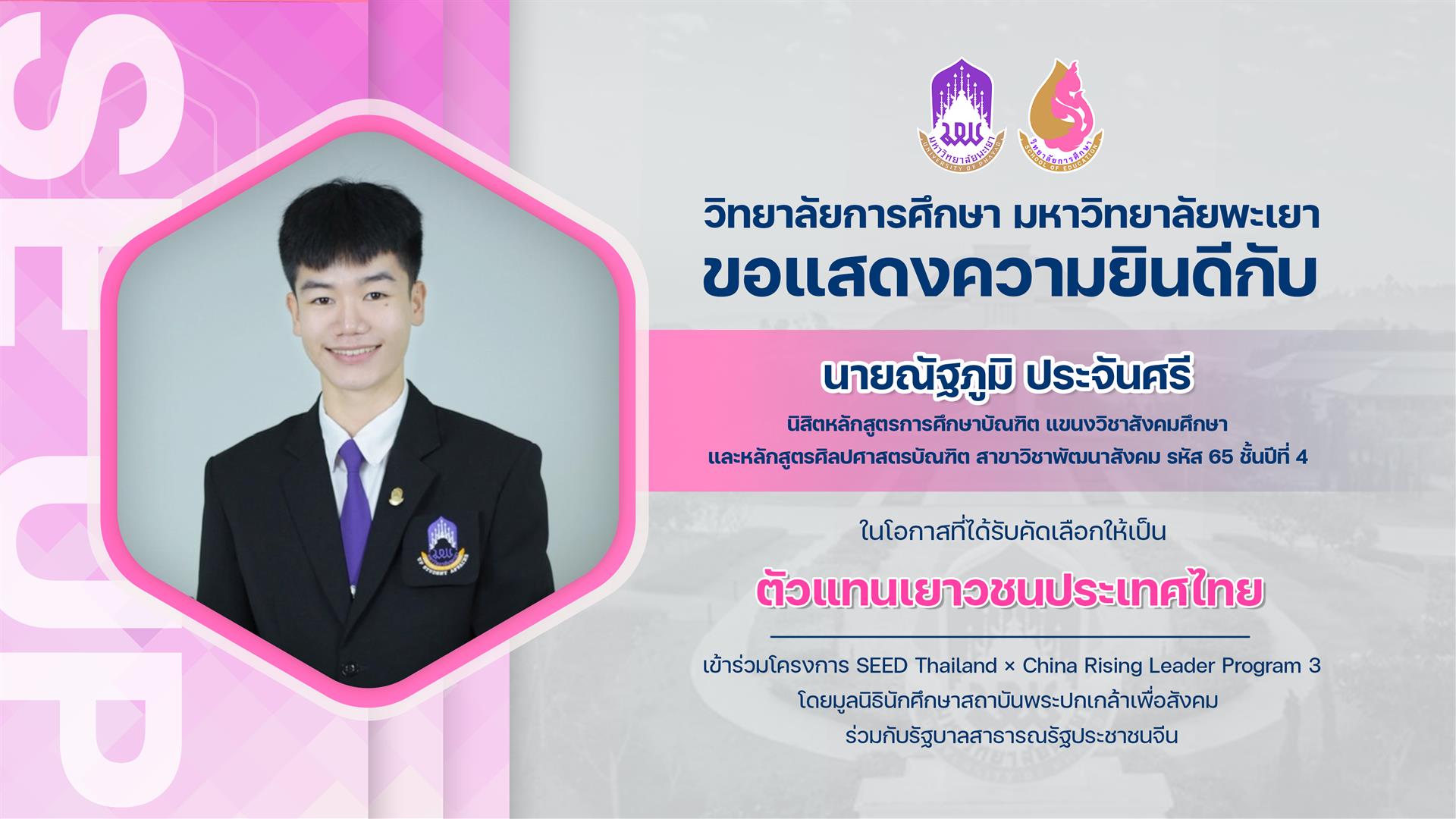 วิทยาลัยการศึกษา มหาวิทยาลัยพะเยา ขอแสดงความยินดีกับ นายณัฐภูมิ ประจันศรี นิสิตหลักสูตรการศึกษาบัณฑิต แขนงวิชาสังคมศึกษา และหลักสูตรศิลปศาสตรบัณฑิต สาขาวิชาพัฒนาสังคม รหัส 65 ชั้นปีที่ 4 ในโอกาสที่ได้รับคัดเลือกให้เป็น ตัวแทนเยาวชนประเทศไทย เข้าร่วมโครงการ SEED Thailand ? China Rising Leader Program 3 โดยมูลนิธินักศึกษาสถาบันพระปกเกล้าเพื่อสังคม ร่วมกับรัฐบาลสาธารณรัฐประชาชนจีน ศึกษาดูงาน ณ สาธารณรัฐประชาชนจีน ระหว่างวันที่ 22 ตุลาคม – 4 พฤศจิกายน 2568
