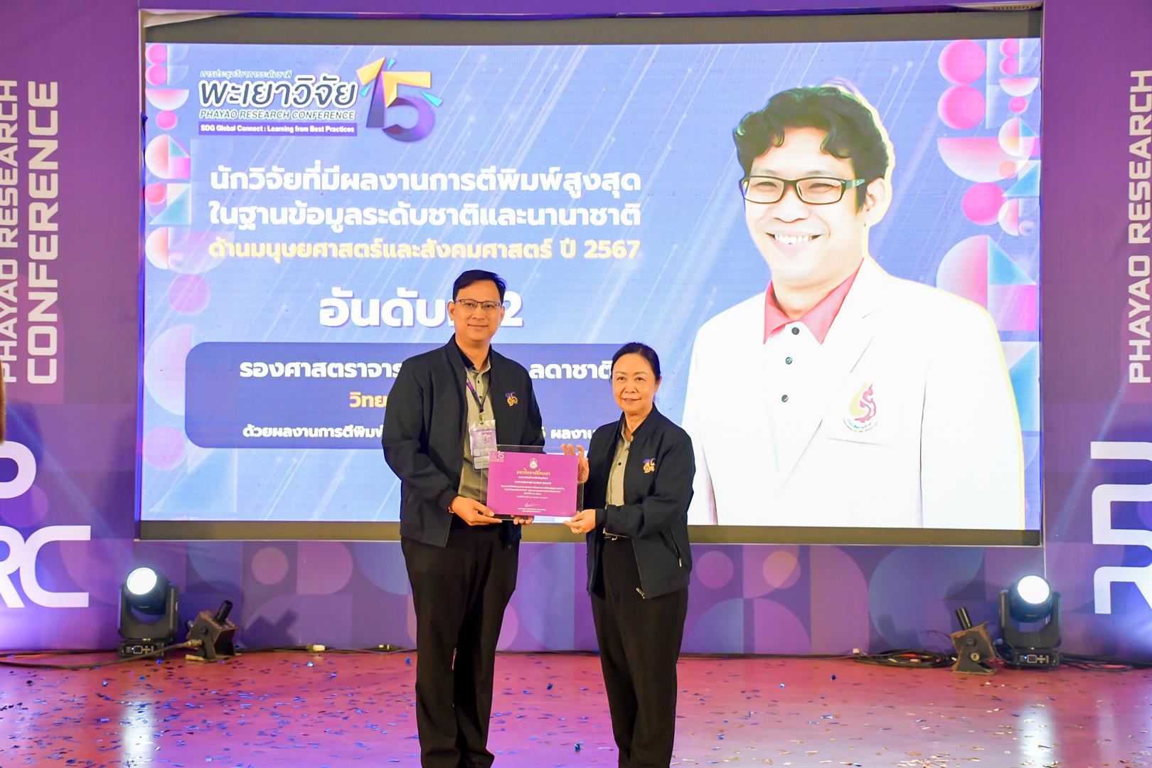ในโอกาสนี้ วิทยาลัยการศึกษาได้รับ โล่รางวัลระดับ “Gold” จากผลการดำเนินงานโครงการ 1 คณะ 1 SDG ประจำปี 2568 จากผลงานวิจัยเรื่อง “แนวทางการพัฒนาทักษะการเรียนรู้ตลอดชีวิต เพื่อยกระดับสุขภาวะผู้สูงอายุ โดยใช้ชุมชนเป็นฐาน กรณีศึกษา : ศูนย์พัฒนาคุณภาพชีวิตและส่งเสริมอาชีพผู้สูงอายุ ตำบลจำป่าหวาย จังหวัดพะเยา” โดยมี ผู้ช่วยศาสตราจารย์ ดร.วัชระ จตุพร รองคณบดีฝ่ายวิจัยและบริการวิชาการเชิงพื้นที่ เป็นหัวหน้าโครงการ นอกจากนี้ ยังได้รับ รางวัลนักวิจัยดีเด่น มหาวิทยาลัยพะเยา ประจำปี 2567 ด้านมนุษยศาสตร์และสังคมศาสตร์ อันดับที่ 2 ได้แก่ รองศาสตราจารย์ ดร.ลือชา ลดาชาติ ประธานหลักสูตรการศึกษามหาบัณฑิต สาขาวิชาสะเต็มศึกษา