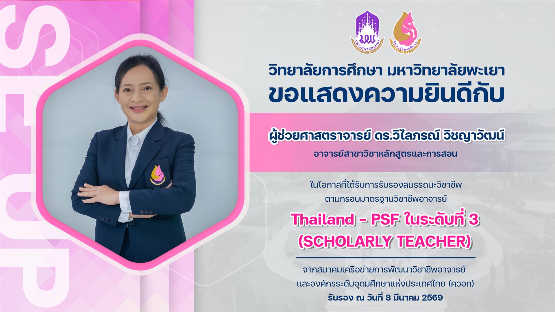 วิทยาลัยการศึกษา ขอแสดงความยินดีกับ ผู้ช่วยศาสตราจารย์ ดร.วิไลภรณ์ วิชญาวัฒน์ อาจารย์สาขาวิชาหลักสูตรและการสอน ในโอกาสที่ได้รับการรับรองสมรรถนะวิชาชีพตามกรอบมาตรฐานวิชาชีพอาจารย์ Thailand - PSF ในระดับที่ 3 จากสมาคมเครือข่ายการพัฒนาวิชาชีพอาจารย์ และองค์กรระดับอุดมศึกษาแห่งประเทศไทย (ควอท) รับรอง ณ วันที่ 8 มีนาคม 2569
