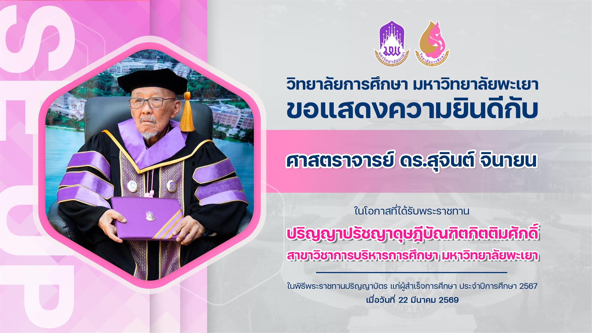 วิทยาลัยการศึกษา ขอแสดงความยินดีกับ ศาสตราจารย์ ดร.สุจินต์ จินายน ในโอกาสที่ได้รับพระราชทาน ปริญญาปรัชญาดุษฎีบัณฑิตกิตติมศักดิ์ สาขาวิชาการบริหารการศึกษา มหาวิทยาลัยพะเยา วิทยาลัยการศึกษา มหาวิทยาลัยพะเยา ขอแสดงความยินดีกับ ศาสตราจารย์ ดร.สุจินต์ จินายน ในโอกาสที่ได้รับพระราชทาน ปริญญาปรัชญาดุษฎีบัณฑิตกิตติมศักดิ์ สาขาวิชาการบริหารการศึกษา มหาวิทยาลัยพะเยา ในพิธีพระราชทานปริญญาบัตร แก่ผู้สำเร็จการศึกษา ประจำปีการศึกษา 2567 เมื่อวันที่ 22 มีนาคม 2569 ภาพ :  ฝ่ายประชาสัมพันธ์วิทยาลัยการศึกษา ข้อมูล/ข่าว :   khomthit.cha เพิ่มข่าวโดย :  khomthit.cha@up.ac.th วันที่/เวลา :23/3/2569 9:45:36 ข่าวล่าสุด | ข่าวทั้งหมด 10 เม.ย. 2569 #การบริการวิชาการ วิทยาลัยการศึกษา ดำเนินโครงการการปรับปรุงและพัฒนาหลักสูตรตามเกณฑ์มาตรฐานหลักสูตรและกรอบมาตรฐานคุณวุฒิระดับอุดมศึกษา 76 อ่านเพิ่มเติม 1 เม.ย. 2569 #การผลิตบัญฑิต วิทยาลัยการศึกษา ดำเนินโครงการกิจกรรมเสริมความเป็นครูและกิจกรรมเสริมทางวิชาชีพตามมาตรฐานวิชาชีพคุรุสภา กิจกรรมที่ 2 การส่งเสริมกิจกรรมลูกเสือและผู้นำเกมนันทนาการ 107 อ่านเพิ่มเติม 31 มี.ค. 2569 #การผลิตบัญฑิต วิทยาลัยการศึกษา ดำเนินโครงการกิจกรรมเสริมความเป็นครูและกิจกรรมเสริมทางวิชาชีพตามมาตรฐานวิชาชีพคุรุสภา กิจกรรม 1 การส่งเสริมทักษะการสื่อสารในการเรียนรู้ตลอดชีวิต 151 อ่านเพิ่มเติม 25 มี.ค. 2569 #การบริการวิชาการ วิทยาลัยการศึกษา ต้อนรับคณะศึกษาดูงานด้านงานฝึกประสบการณ์วิชาชีพทางการศึกษา จากคณะครุศาสตร์ มหาวิทยาลัยราชภัฏอุดรธานี 188 อ่านเพิ่มเติม © SE.UP.AC.TH เพิ่มข่าวประชาสัมพันธ์ สำหรับเจ้าหน้าที่ ×Close EDIT MODE